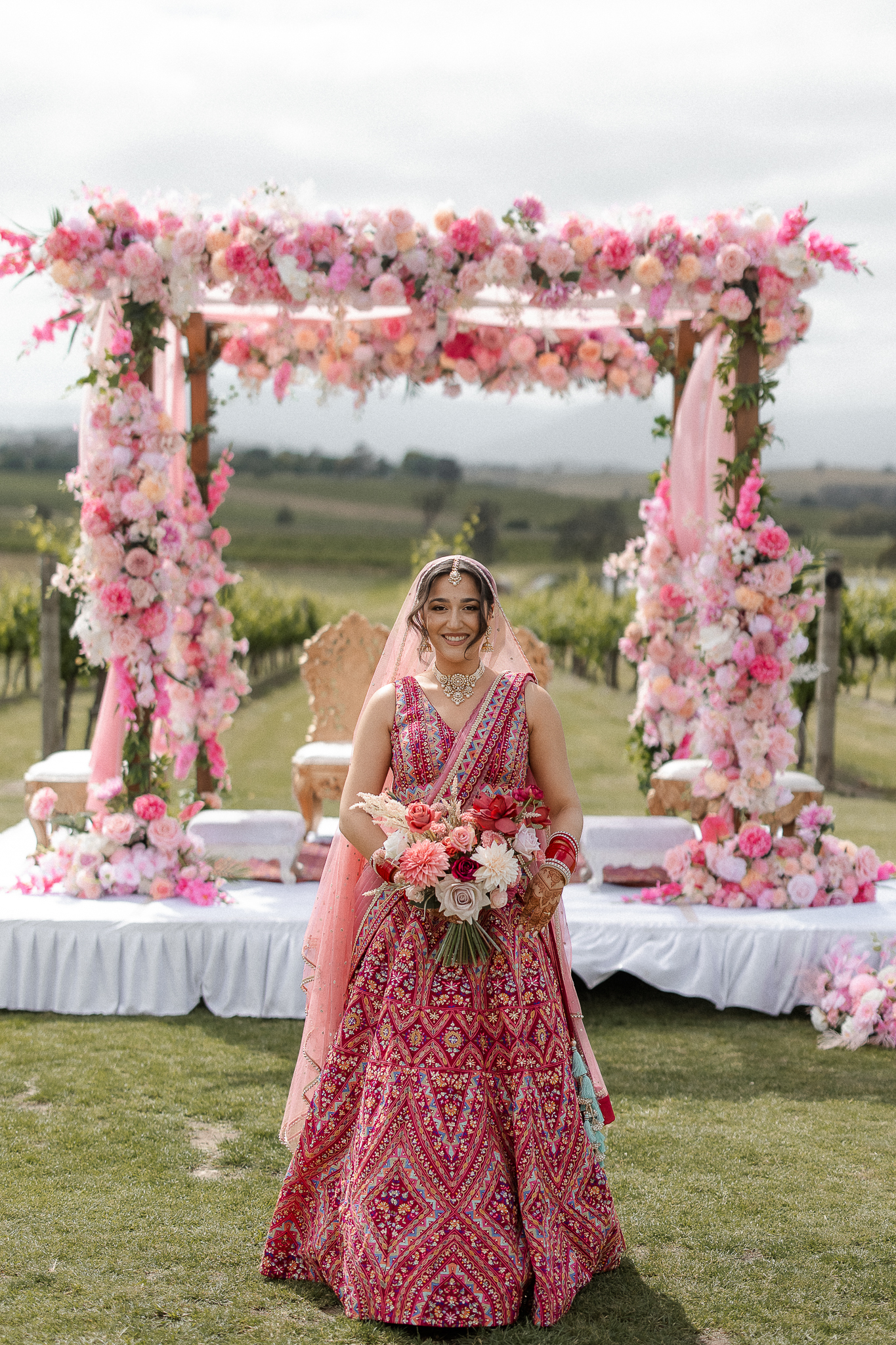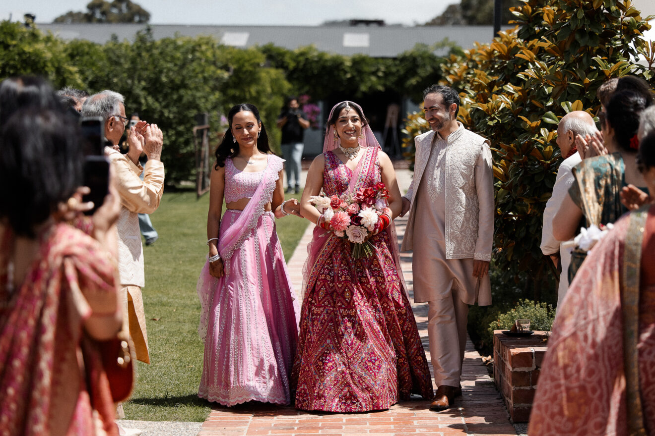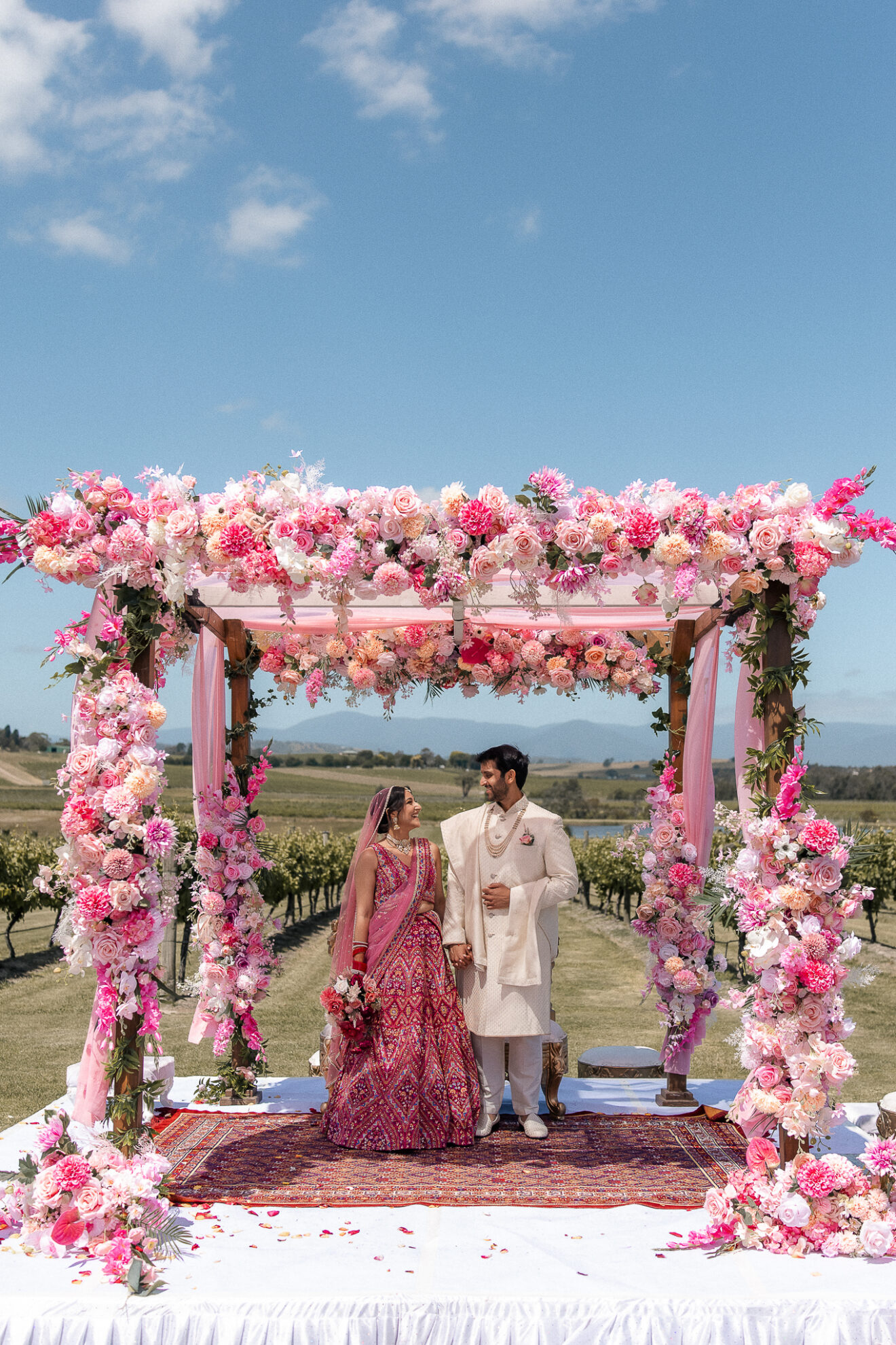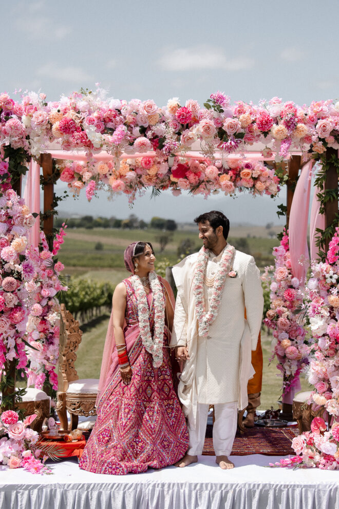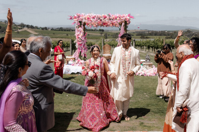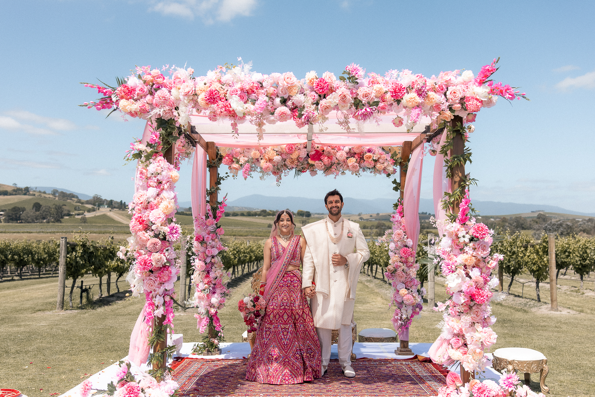 Set against the rolling vineyards of Acacia Ridge, Reetika and Karan’s wedding was nothing short of magical. After capturing their vibrant Sangeet and Mehndi night their wedding day brought a beautiful softness to the celebration, with a palette of whites and soft pinks woven throughout every detail.