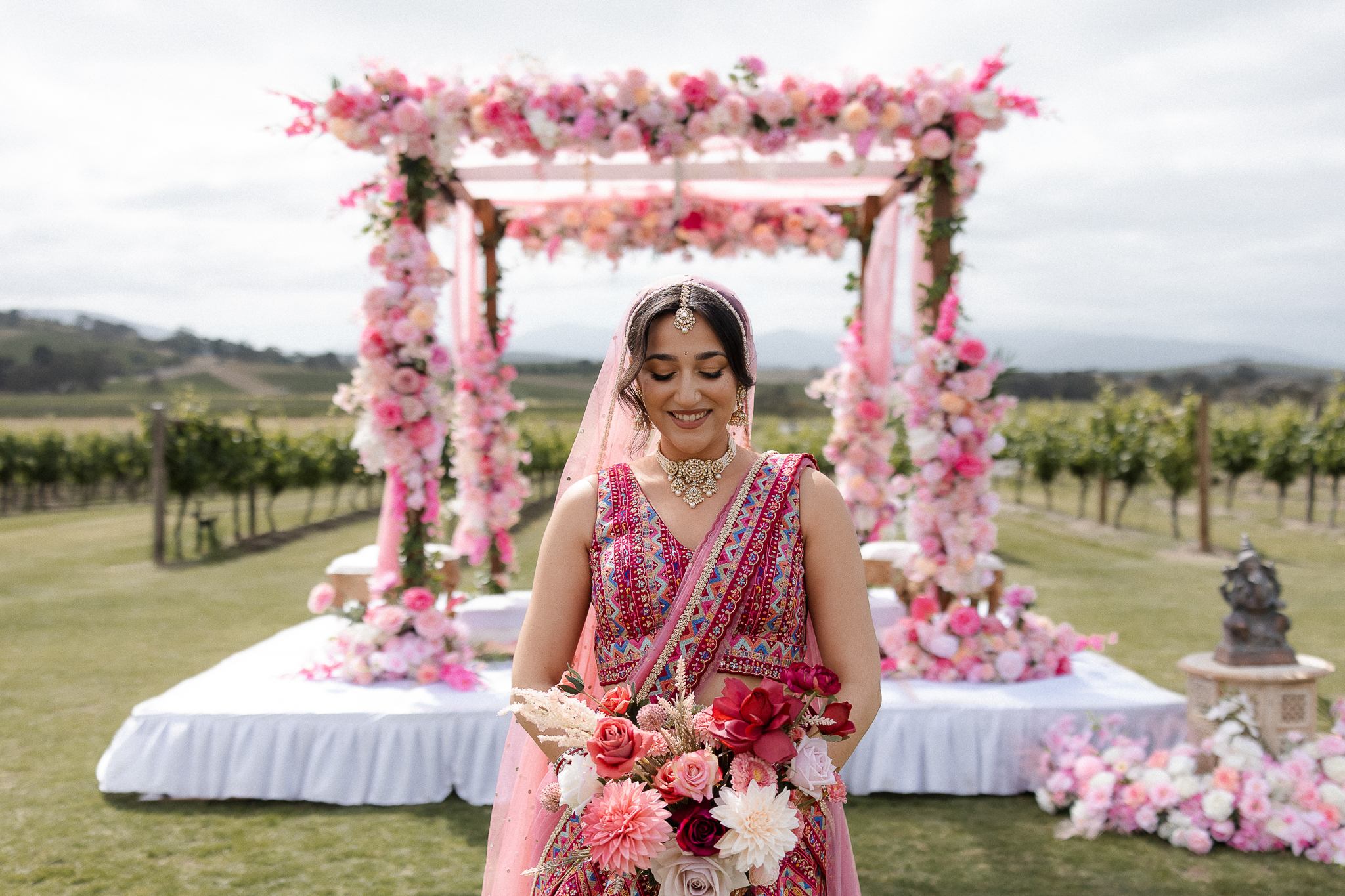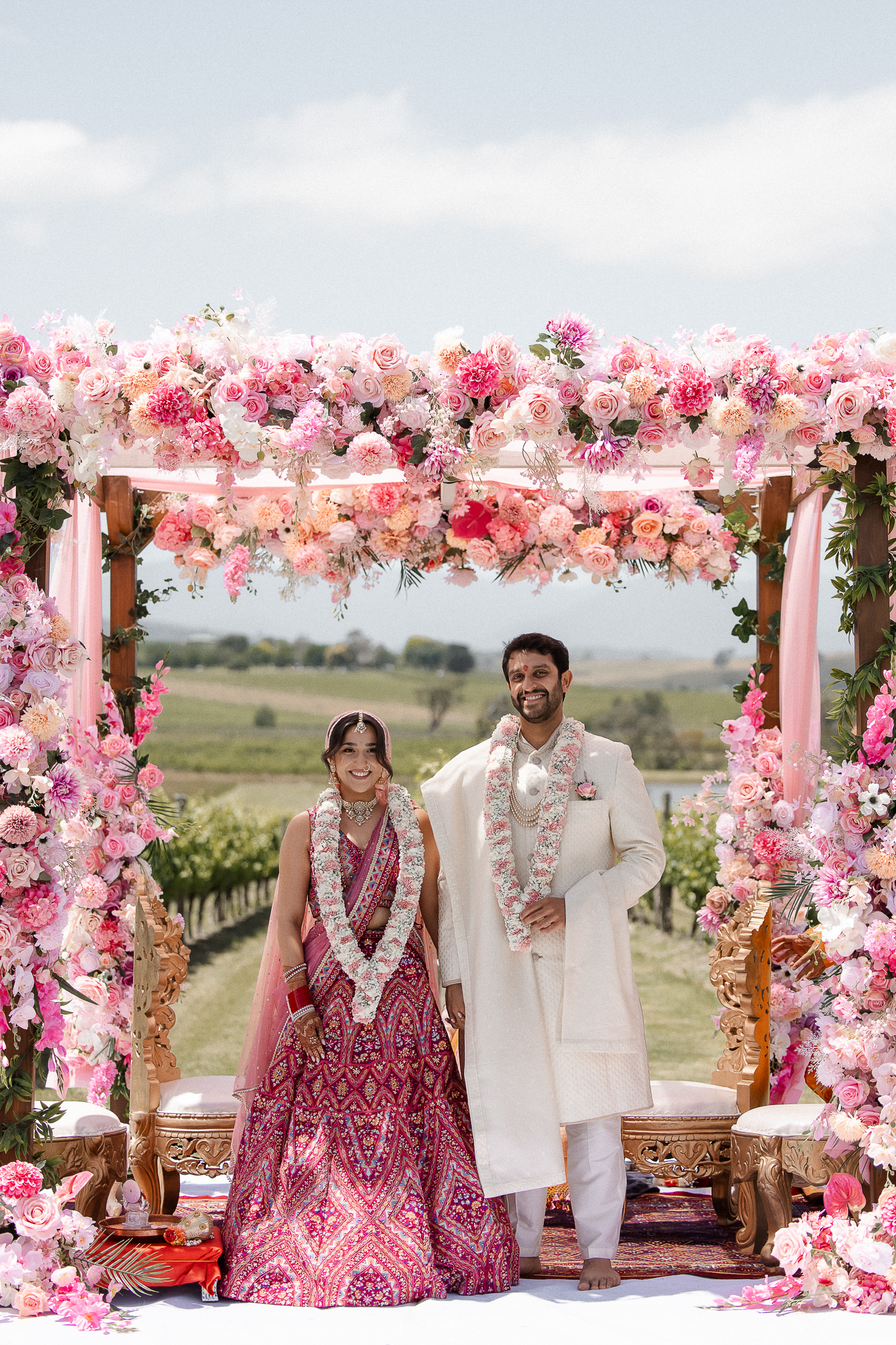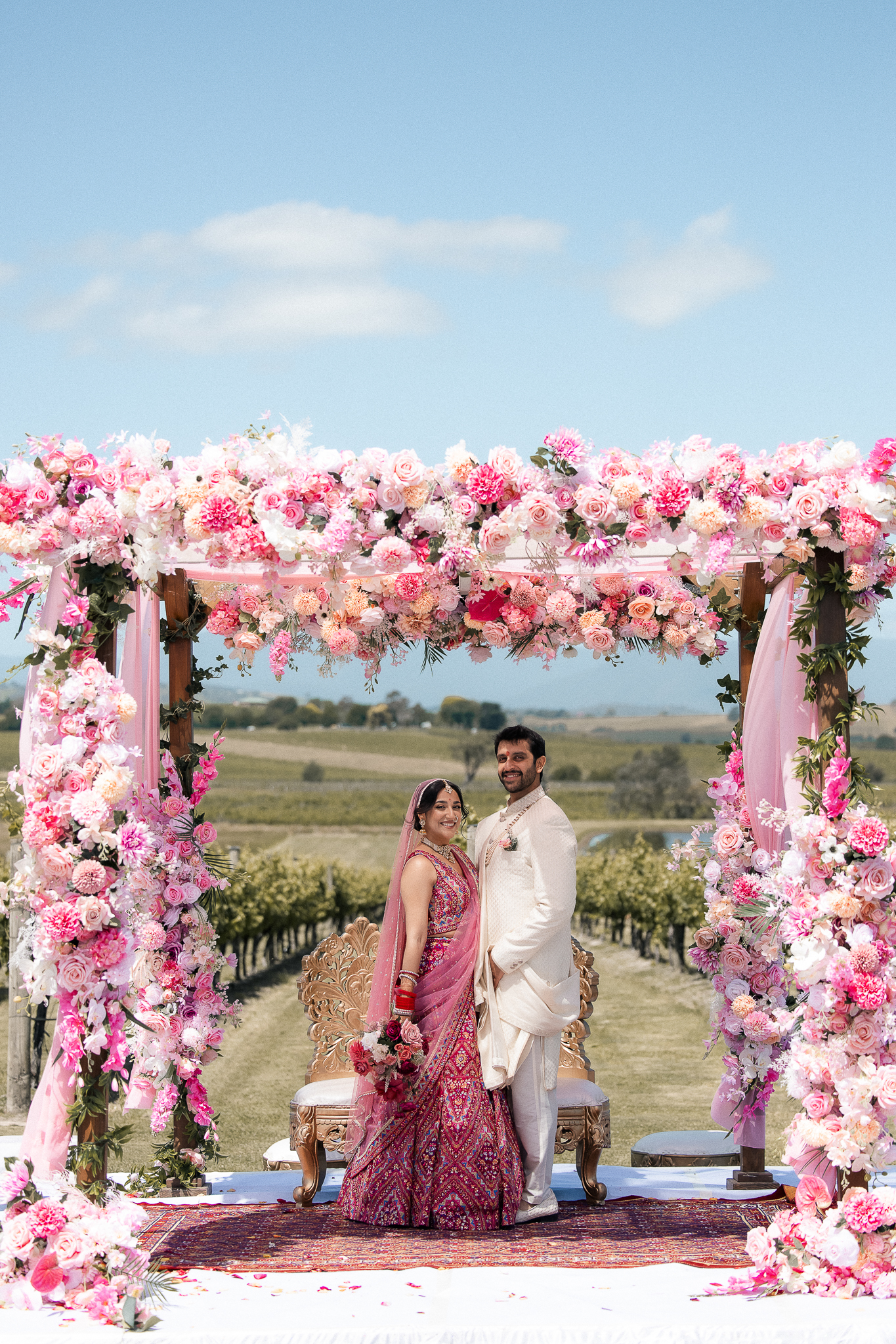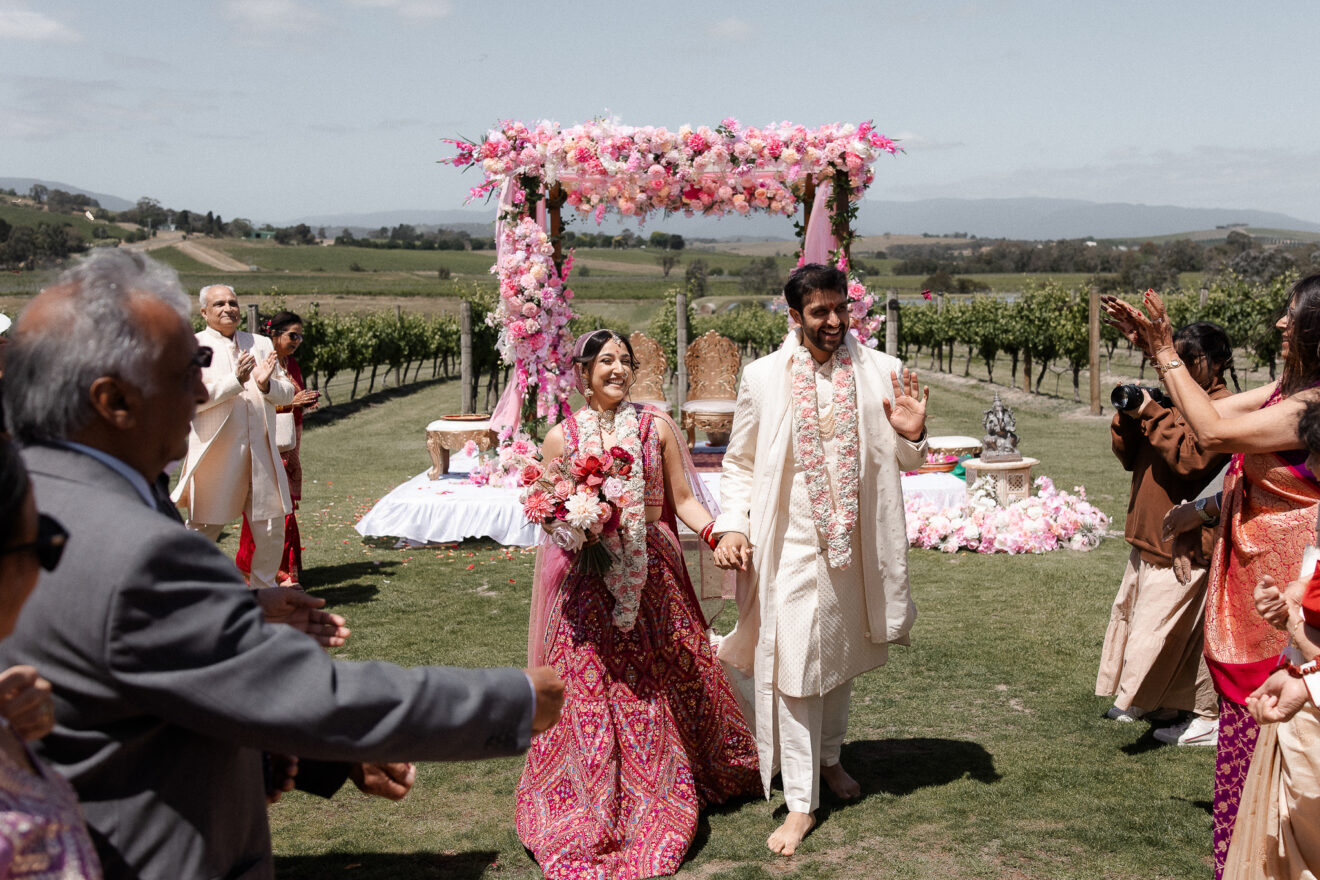 Set against the rolling vineyards of Acacia Ridge, Reetika and Karan’s wedding was nothing short of magical. After capturing their vibrant Sangeet and Mehndi night their wedding day brought a beautiful softness to the celebration, with a palette of whites and soft pinks woven throughout every detail.