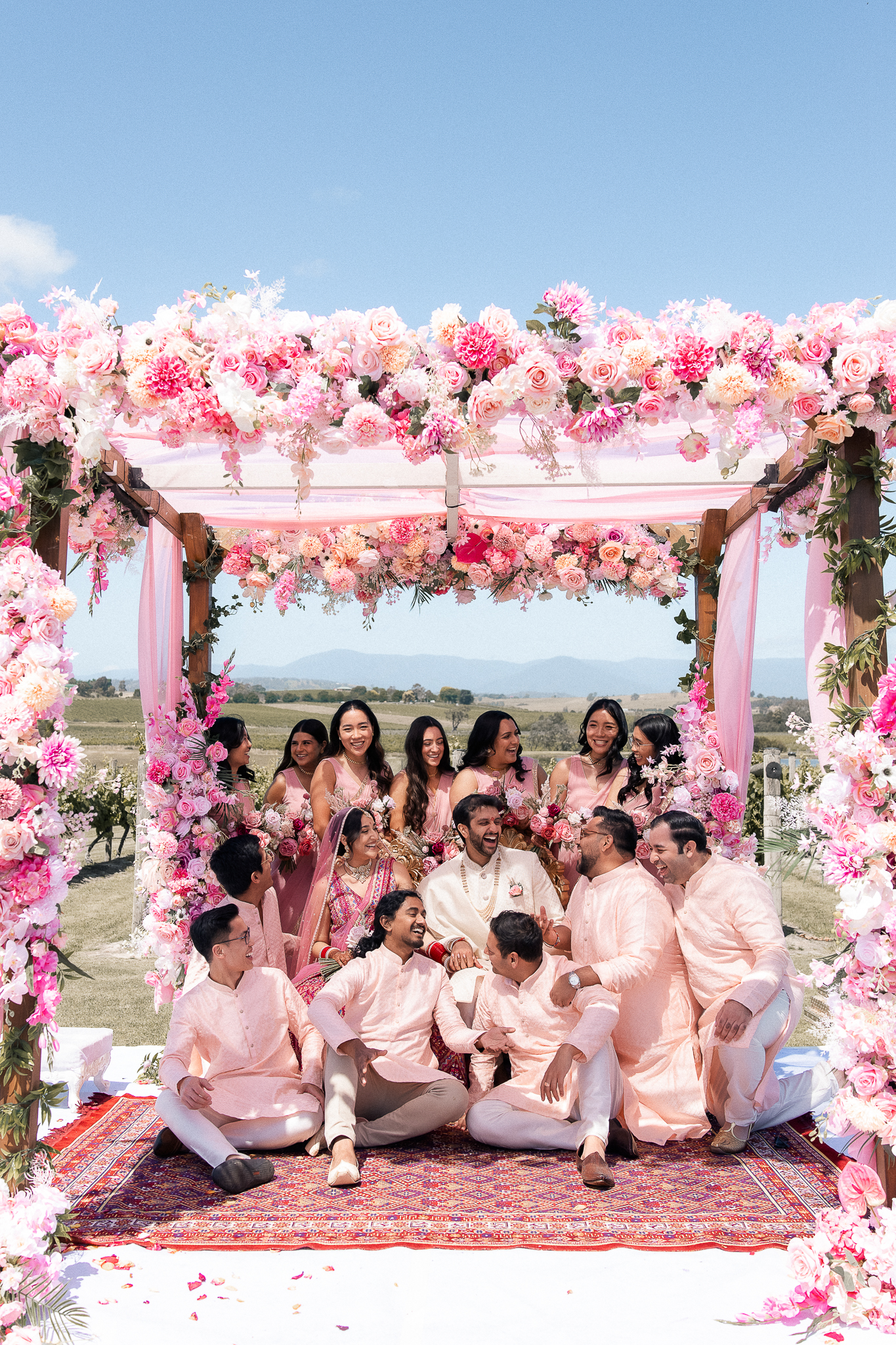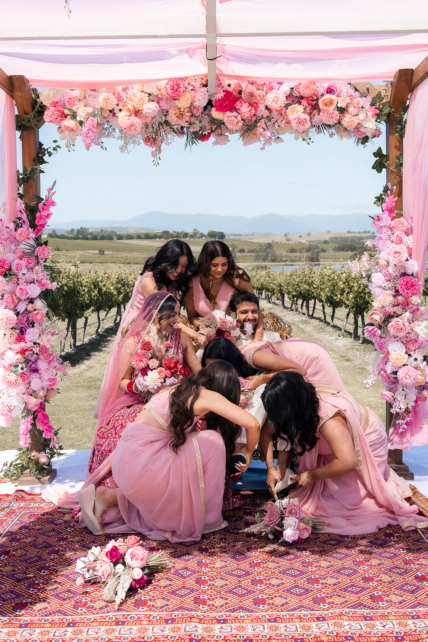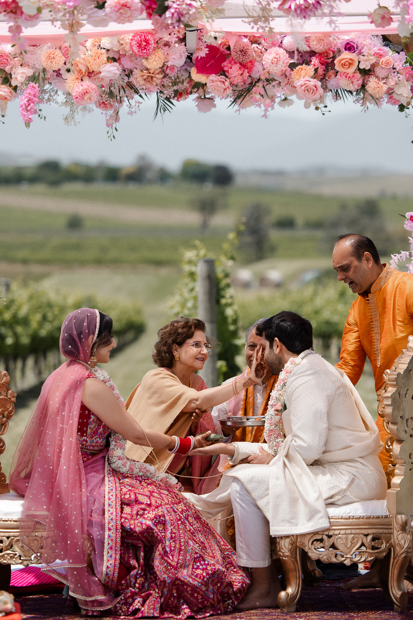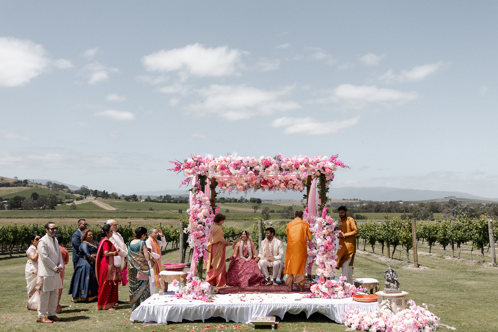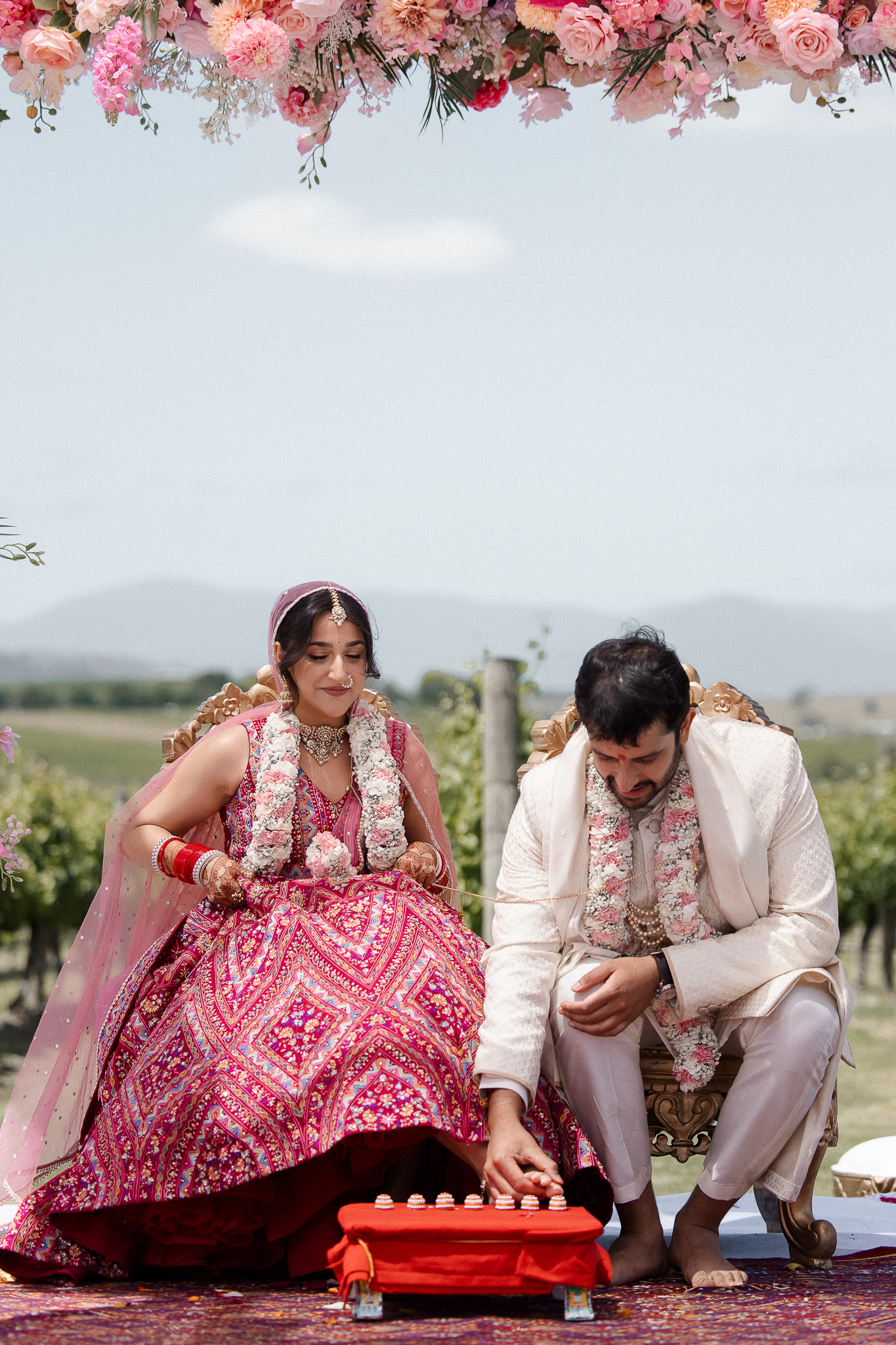 Set against the rolling vineyards of Acacia Ridge, Reetika and Karan’s wedding was nothing short of magical. After capturing their vibrant Sangeet and Mehndi night their wedding day brought a beautiful softness to the celebration, with a palette of whites and soft pinks woven throughout every detail.